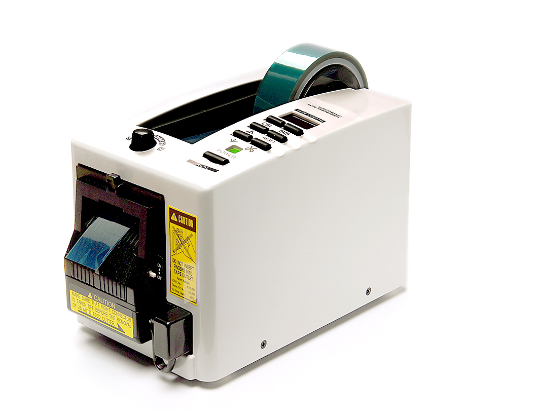 Universele Tapedispenser voor tape van 8 – 50 mm breedte. Met elektrische aandrijving. tape lengtes in mm programmeerbaar in stukken van 30 – 999 mm lengte. Met digitaal display en foto-elektrisch afsnijmechanisme. Geintregeerde vingerbescherming volgens DIN 31001, uitvoering volgens CE-Norm.